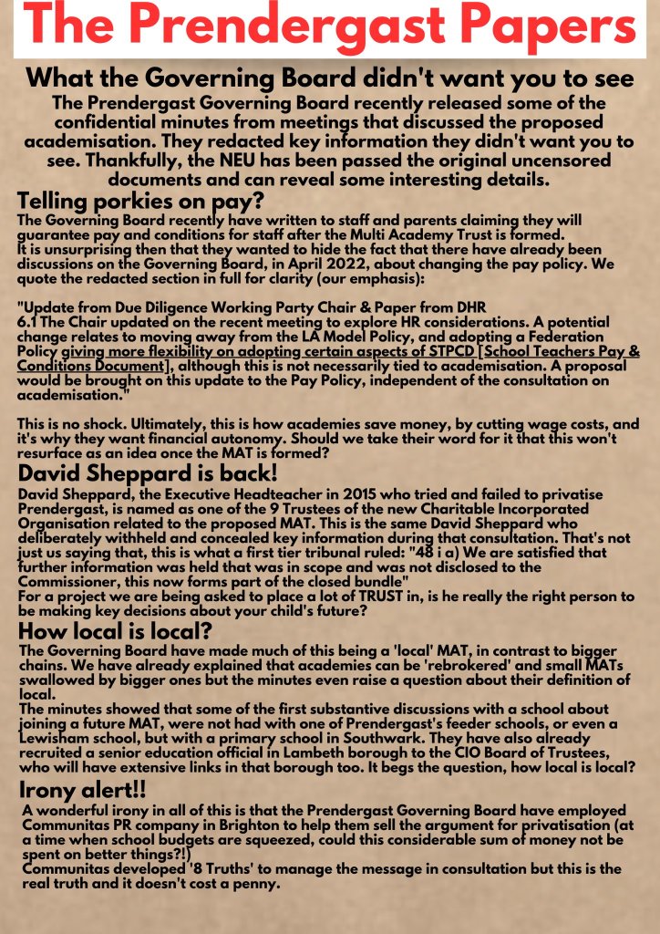 Prendergast Governing Board recently released some of the confidential minutes from meetings that discussed the proposed academisation. They redacted key information they didn’t want you to see. Thankfully, the NEU has been passed the original uncensored documents and can reveal some interesting details.