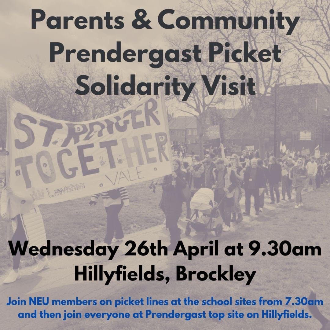 Join NEU members on picket lines at the school sites from 7.30am on Wednesday 26th April and then join everyone at Prendergast top site on Hillyfields at 9.30am.